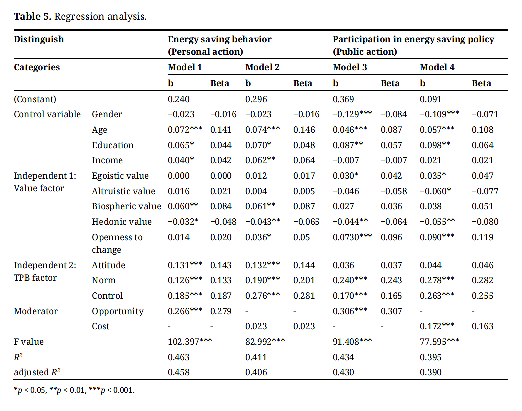 Conclusions: Based on the above findings, the research implications are as follows. First, we confirm the multidimensionality of energy saving behavior in that that the variables explaining energy saving behavior are not consistent from a theoretical perspective. Second, we verified that opportunities and costs that individuals face have an effect through interactions with variables that do not significantly explain behavior.
