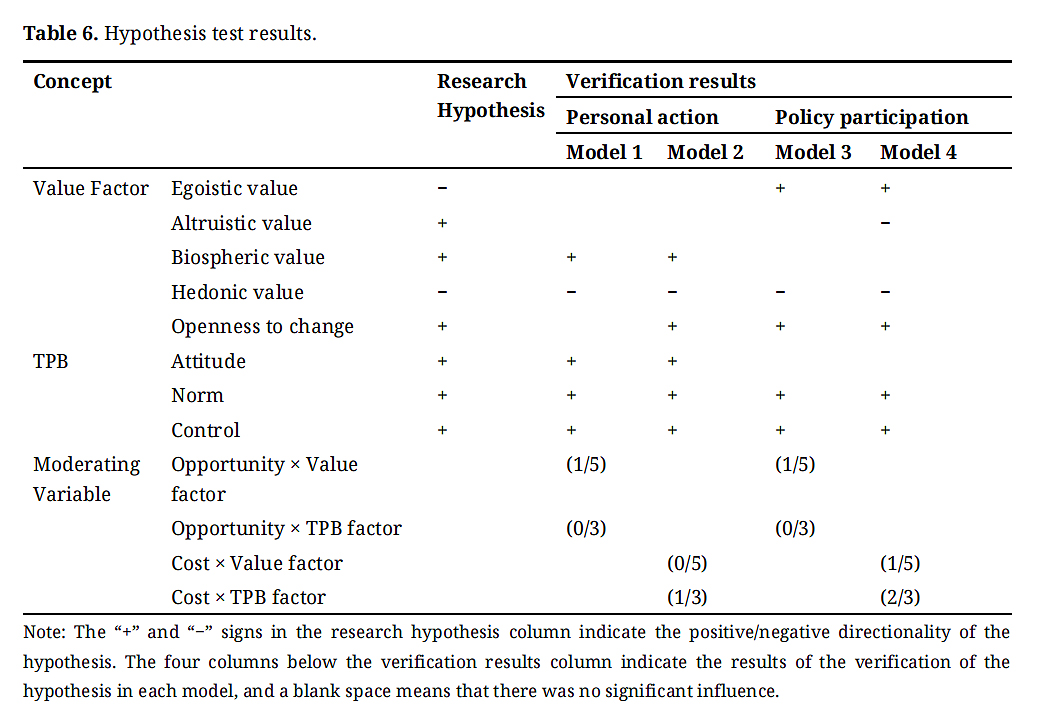 Overall, biospheric and openness to change in values have a positive effect on personal action behavior, while hedonic values have a negative effect on personal action behavior and public policy participation. In TPB, attitudes, norms, and feelings of control are the factors that decrease action behavior and policy engagement. Notably, contrary to the hypothesis, selfish values drive policy engagement and altruistic values decrease policy engagement. These findings suggest that self-interest should be reflected in motivation factor in policy participation.