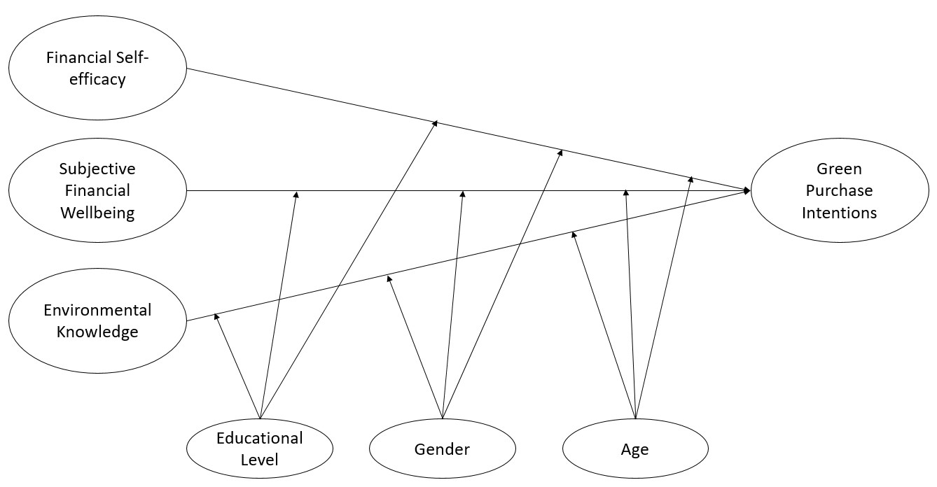 Since educational level [19,67], age and gender [19,79] can influence environmental knowledge and financial position and stability, it can be argued that the relationship between environmental knowledge, financial self-efficacy and subjective financial wellbeing on one hand and green purchase intention on the other hand can be moderated by educational level, gender and age. Thus, the following hypotheses are developed: