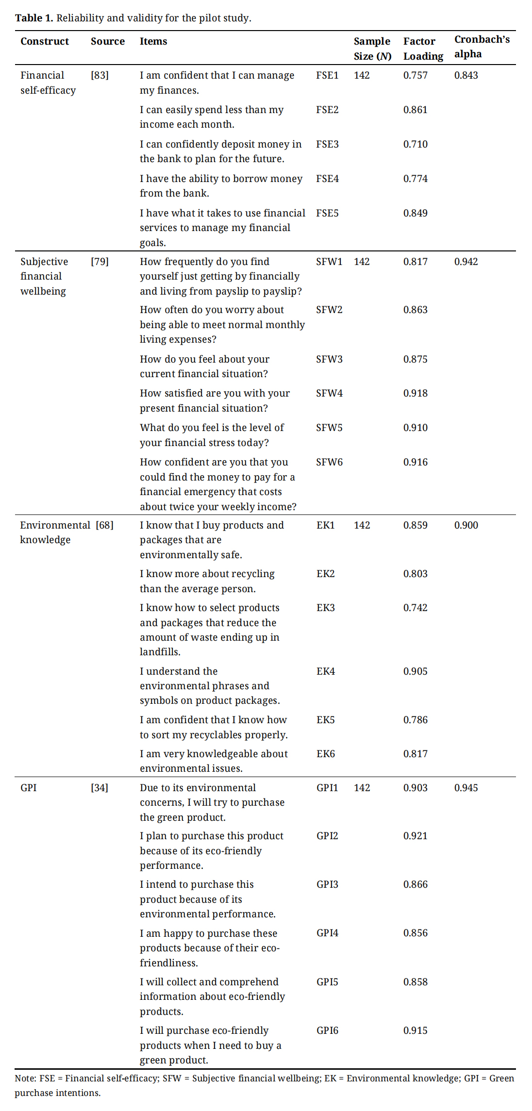 A group of experts was consulted (3 practitioners and 3 academics) to ensure face and content validity, in addition to translation accuracy in the pre-test. Then, a pilot study was carried out through distributing 172 questionnaires, of which only 142 were valid, completed and collected. This means that the response rate was 82.56%. These 142 questionnaires were analysed to ensure construct validity and reliability, using factor loadings and Cronbach’s alpha, which was calculated using SPSS. Table 1 shows factor loading and Cronbach’s alpha for all items and constructs, which illustrates that validity and reliability requirements were met. The questionnaire was distributed (pilot and main study) to individuals with age of 30 and above, as most probably they have a bank account and stable cash flow to some extent through a decent job, which will allow them to answer the questionnaire accurately.