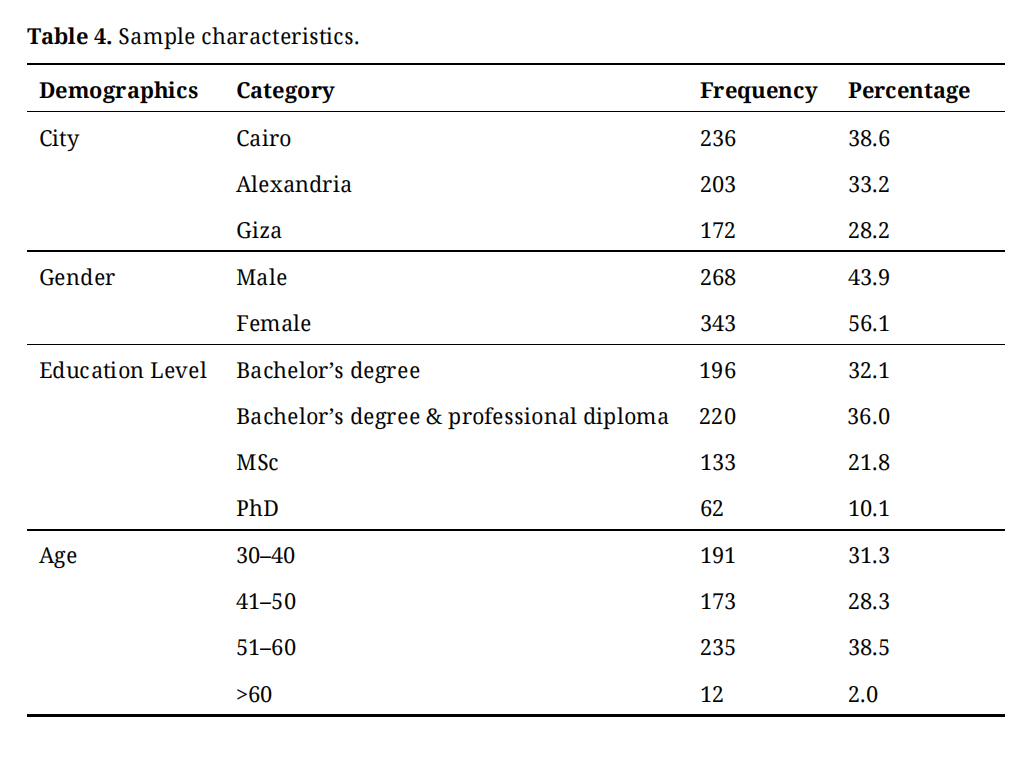 Table 4 illustrates sample characteristics of the 611 individuals who participated in the main study. Originally, 680 questionnaires were distributed, and 660 were collected, with 49 incompletes, which means the response rate is 89.85%.