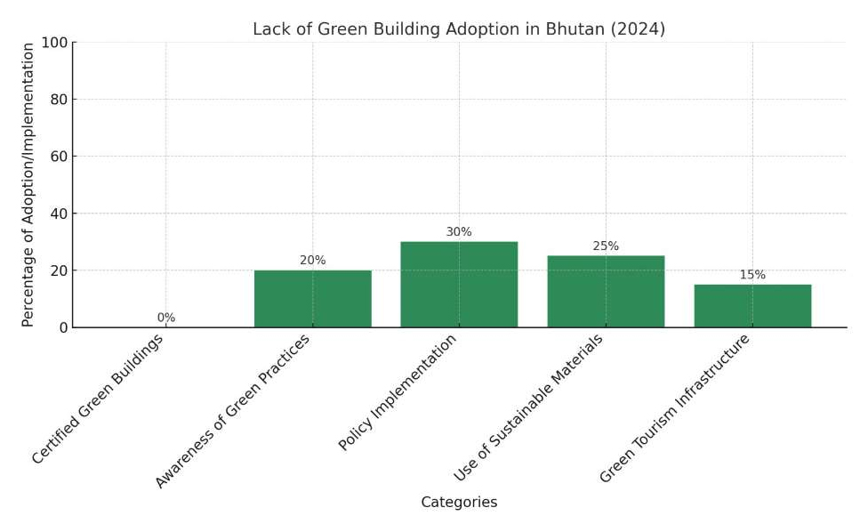 The bar chart (Figure 1) illustrates the lack of green building adoption in Bhutan across several key categories, using hypothetical percentages derived from observed trends and reports. It highlights the following: