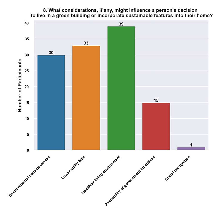 Low Utility Bills (28.2%). Many respondents cited cheaper utility bills as a driving force, indicating green buildings’ financial advantages. The potential for lower energy usage and utility costs can be a strong motivator for selecting green housing alternatives in Bhutan, where residents prioritize affordability and energy access.