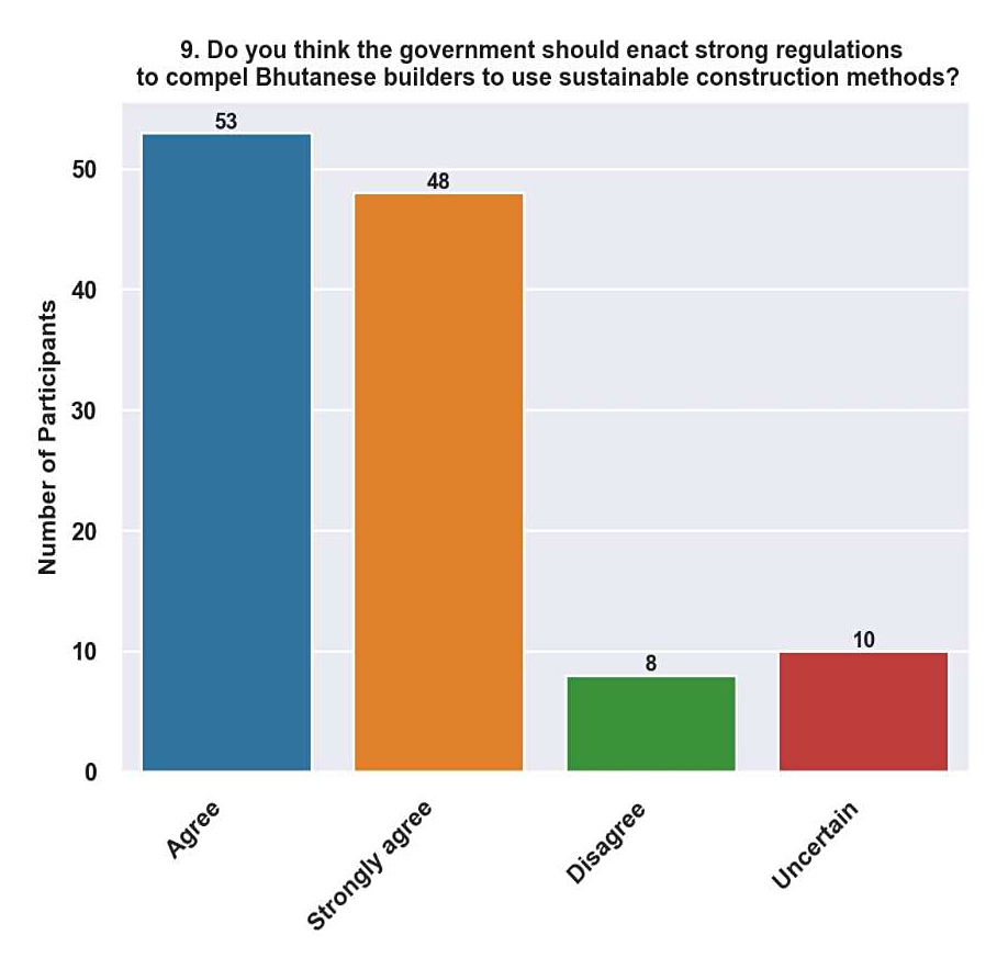 Discussion of Respondence to Question No.944.9% of respondents agree, and 39.8% strongly agree that the government should enact strong regulations to promote Bhutanese builder’s sustainable construction methods (Figure 11). The aggregate proportion of participants who express or strongly agree suggests a resounding endorsement of government involvement in advancing environmentally friendly building techniques. This implies a general understanding of the limitations of volunteer initiatives and the necessity of regulatory frameworks to promote systemic change and guarantee industry responsibility.