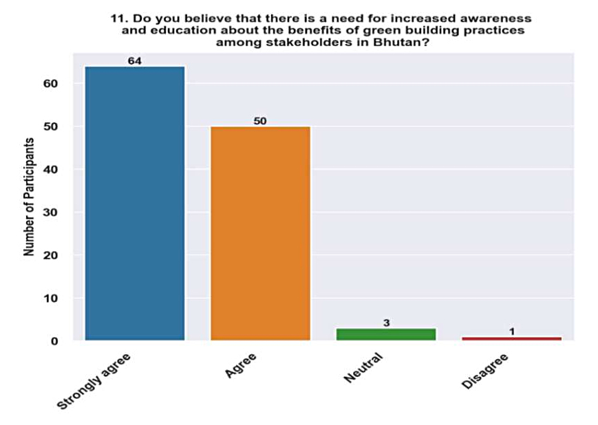 The comparatively high proportion of people in Bhutan who are at least somewhat aware of the environmental benefits of green building may be ascribed to continuous efforts to promote sustainability through advocacy, education, and policy interventions, as environmental conservation is deeply ingrained in national policies and cultural values. Nonetheless, there might still be chances to engage and educate stakeholders further to increase their comprehension and appreciation.