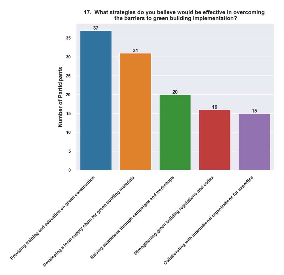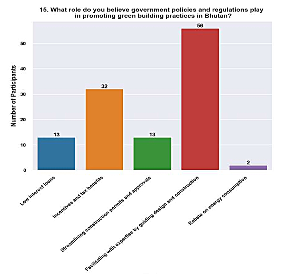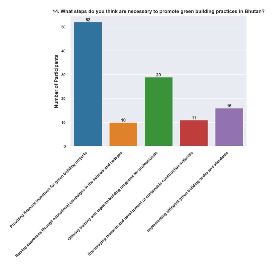 Offering Training and Capacity-Building Programs for Professionals (24.8%). The considerable proportion of participants who prioritized training and capacity development initiatives highlights the significance of augmenting the abilities and expertise of professionals operating in the construction industry. Architects, engineers, contractors, and other stakeholders can benefit from training programs that offer specific knowledge in green building technology, best practices, and concepts. Bhutan can develop a trained labour force capable of completing high-calibre, environmentally friendly building projects and spearheading changes in the sector by investing in human capital development.