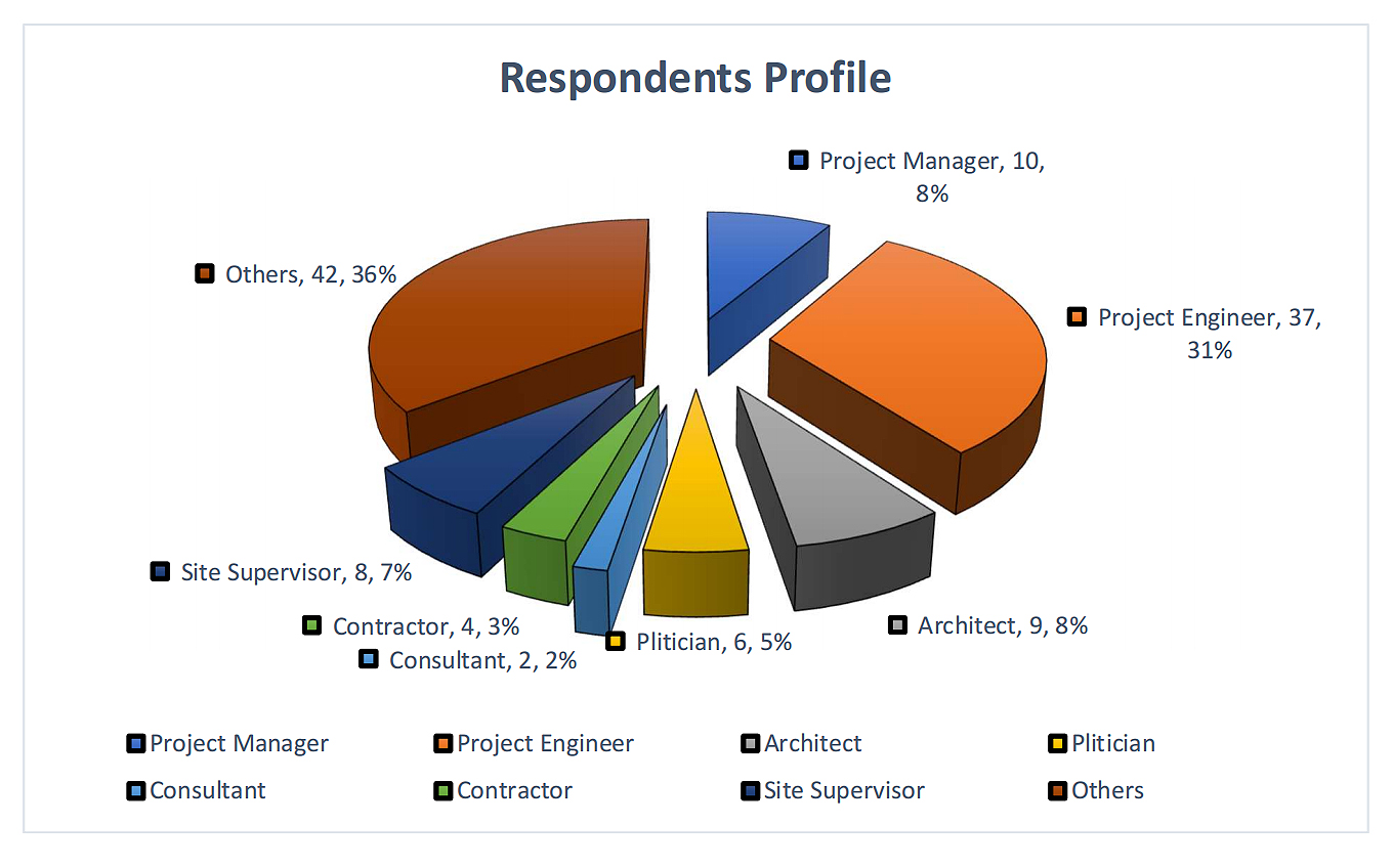 Project managers make up 8% of the respondents. They are responsible for managing construction projects from start to finish [44]. They oversee resources, manage a variety of stakeholders, and guarantee that projects are completed on schedule and within budget. Project managers are essential to implementing green construction projects in Bhutan. They prioritize sustainability objectives throughout the project lifecycle and facilitate collaboration among various teams [45].