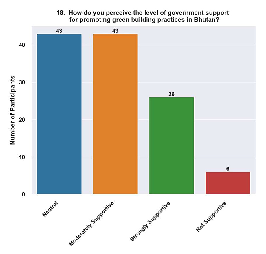 Very Supportive (19.7%). The overwhelmingly affirmative response suggests that respondents have a favourable opinion of the role played by government initiatives in encouraging green building in Bhutan. This shows that those involved think the policies are successful, have an impact, and support national environmental preservation and sustainability goals.