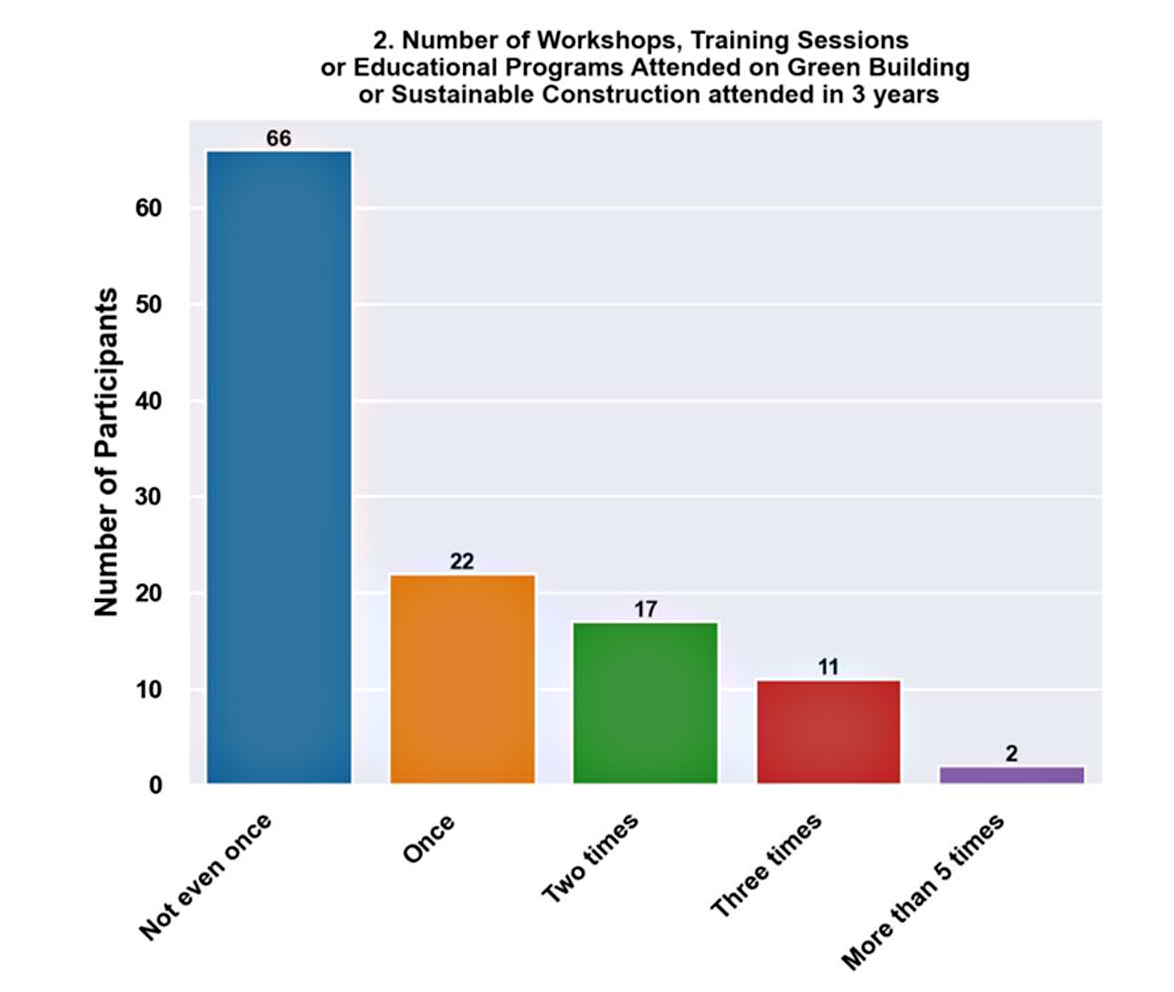 Attended Three Times (9.4%). The comparatively lower proportion of participants got to undergo workshops or training sessions three times in three years. These sections of people are primarily architects and project managers; however, project engineers and site supervisors need to gain exposure to sustainable approaches to construction. These people could influence industry standards and bring about positive change in their organizations and communities by acting as mentors, role models, and champions for sustainability.