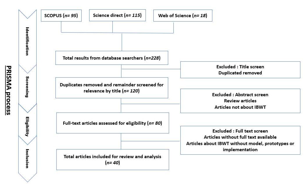 Upon initial acquisition, articles were screened to exclude those unrelated to Inter-Basin Water Transfer, duplicate entries, and non-English publications, yielding 120 studies. Abstract evaluation further eliminated papers that lacked modeling, prototyping, or implementation components, resulting in 80 articles. Following comprehensive full-text examination against research objectives and questions, 40 papers were ultimately selected for analysis. The PRISMA chart of the adopted selection process is shown in Figure 1.
