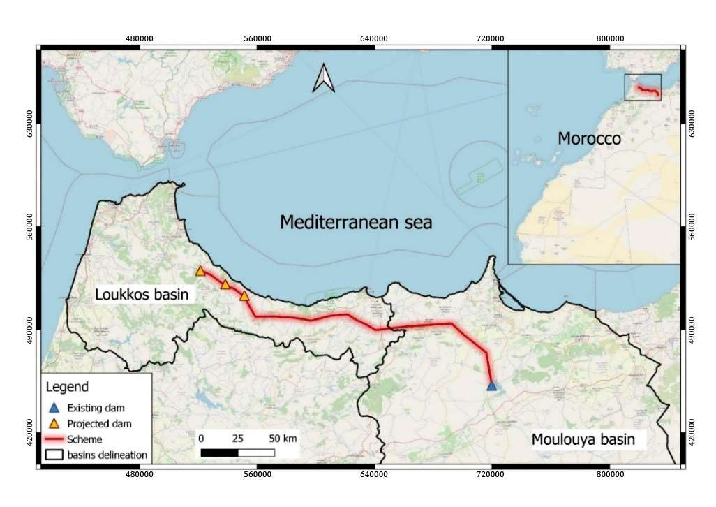 Moroccan hydrological context is very influenced by an annual irregularity and interannual variability of precipitations, and a disparity of their spatial distribution. In fact, two basins located in the northwest of the country, which cover only 7% of the total area, have 51% of the water resources [11]. These areas have significant surpluses and much of the water resources are lost at sea during the wet seasons. However, the central and eastern basins, marked by very important industrial and agricultural poles with unprecedented population growth, have an increasingly negative water balance. To deal with this challenging situation, Moroccan Water Research and Planning Directorate has opted, since 2009, for the idea of transferring surplus water from the north-west basins to the deficit basin in the North-east of the country. Despite the project being currently under study, no scientific research or academic articles have been published to verify its justification, assess its necessity, provide guidance on maximizing its benefits, analyze approaches to mitigate potential negative impacts, or evaluate its sustainability in the face of climate change. This represents a critical knowledge gap in the scientific literature concerning one of Morocco’s most significant water management initiatives.