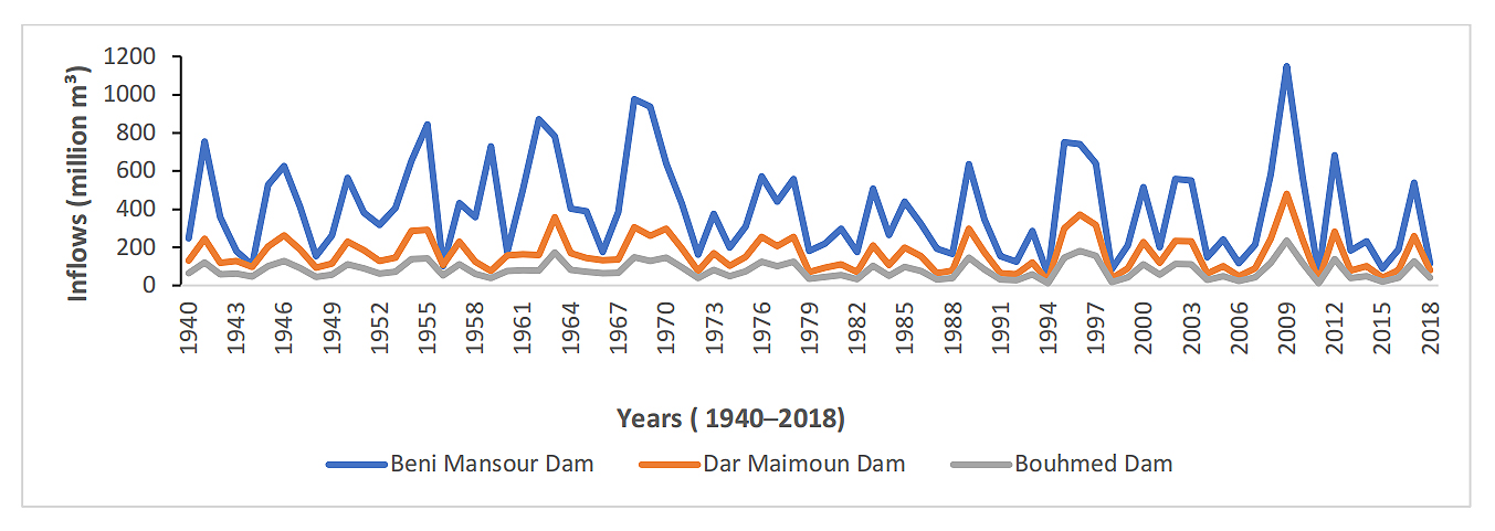 Additionally, to implement the quantitative method outlined in section 3.1 (Study Area). within the context of the studied project, the calculation of the Monthly Mean Flow at 75% dependability was based on time series data of monthly flow rates spanning the period from 1940 to 2018 [53]. Figure 3 illustrates the interannual fluctuations in mean flow at each dam site. It is observed that the different basins of the studied dams share the same hydrological regime; the fluctuations in inflows are practically similar. However, the volume of inflows at each dam site is proportional to the surface area of its watershed. By analyzing the variation in these inflows over time, we can notice a succession of dry and wet periods, highlighting the relevance of the idea of transferring the substantial inflows during rainy years, which are currently lost to the sea, to areas suffering from chronic deficits.