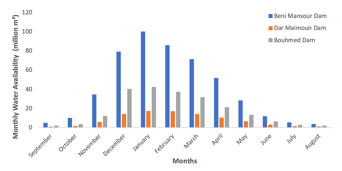 The results of the MWA75 % dep calculation for each projected dam location are shown in Figure 4. It is clear that the most important MWA75 % dep rates are recorded during the rainy season in Morocco, which extends from November to April. On average, the estimated MWA during February exceeds approximately 160 million m3. This reflects the significance of water surplus in the Laou system.