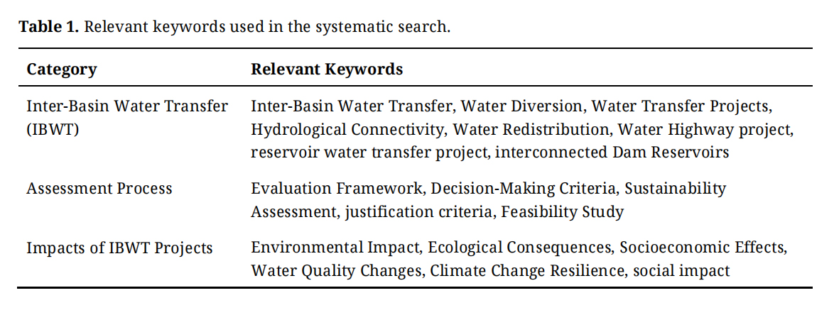 To conduct this systematic review, we began by defining the search keywords, carefully selecting primary terms relevant to the field of study, such as “Inter-Basin Water Transfer”, “assessment process”, and various impacts associated with these projects. A range of keyword combinations, as outlined in Table 1, was employed to identify pertinent scientific articles. The systematic search was carried out across three well-established academic databases: (1) Scopus, (2) Web of Science, and (3) ScienceDirect. In total, 228 articles were retrieved, comprising 95 from Scopus, 18 from Web of Science, and 115 from ScienceDirect.