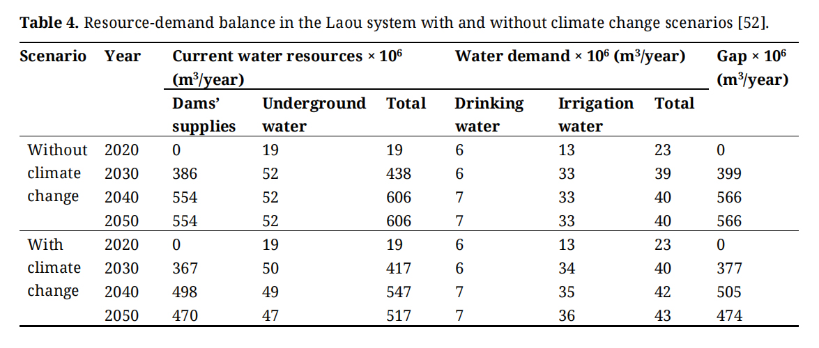 Table 4. Resource-demand balance in the Laou system with and without climate change scenarios [52].