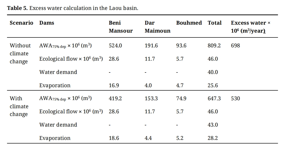 Applying equation (2), the AWA75% dep was calculated for the various donor reservoirs. Then, the overall water surplus in the Laou basin was estimated, without and with climate change consideration, according to the estimates provided by the The Integrated Water Resources Master Plan in Loukkos basin (Table 5). It is observed that the obtained results align with the earlier estimate of water surplus.