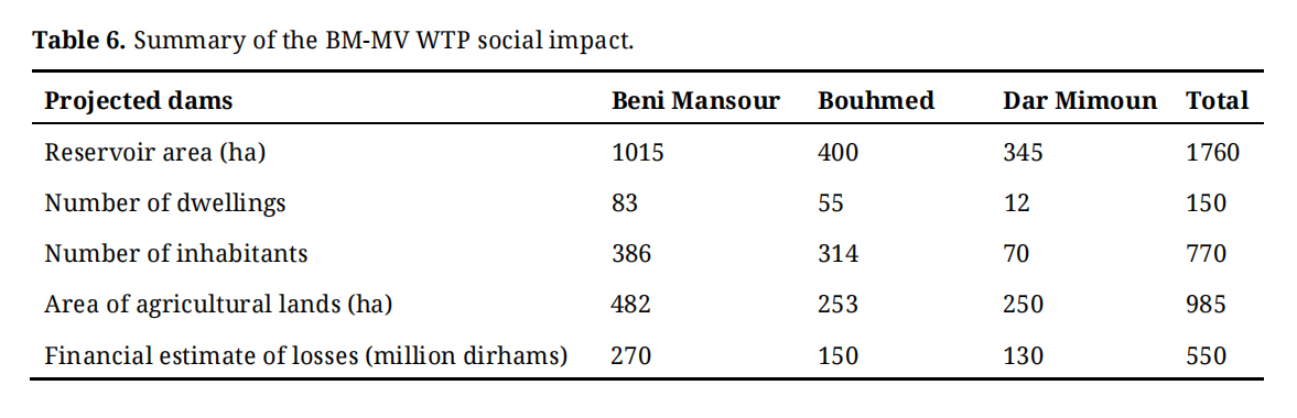 Criterion No. 4: Social ImpactsOur systematic assessment of social impacts, following the 11-step methodological framework, revealed substantial effects of the BM-MV WTP project on local communities. The projected reservoirs will directly affect 150 dwellings housing approximately 770 residents across the three dam locations of Beni Mansour, Bouhmed, and Dar Mimoun. These communities will experience significant disruption as the reservoirs will inundate 1760 hectares of land, with 985 hectares (56%) comprising productive agricultural lands that currently serve as the primary livelihood source for most affected households.
