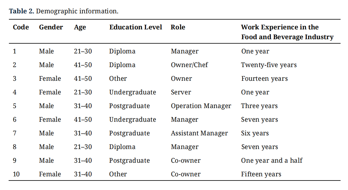 ParticipantsFour women and six men from various backgrounds participated. Some had over ten years of experience in the food and beverage sector, while others had worked in the industry for a year. Table 2 presents the demographic information of each participant.