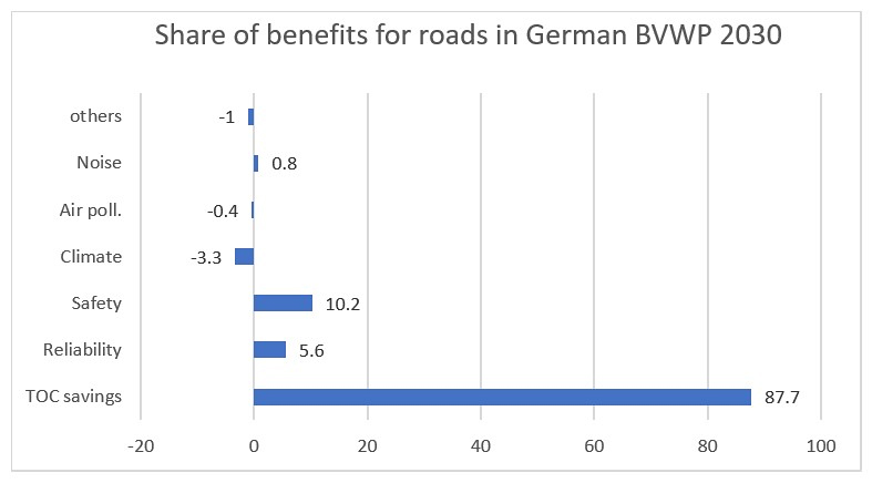 Time and operation costs represent the heart of the benefit measurement. This is demonstrated by Figure 2, which shows the share of benefit components for road evaluations in the German Federal Transport Master Plan (BVWP 2030 [31]). The savings of travel time and operating costs make up 87.7% of total benefits of road investments while the impact on climate is negative (‒3.3%).