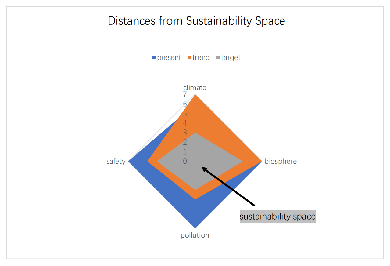Such constraints can virtually form a sustainability space. Sustainable infrastructure development plans would be located within this space. Figure 3 provides a simple numerical example for the graphical representation of a sustainability space. It illustrates the distances between the present situation and future scenarios according to trend development and to constraint settings (normalised on a scale between 1 (ideal) and 10 (most pessimistic)). The distances indicate the major challenges for infrastructure planning for approaching a sustainability path.