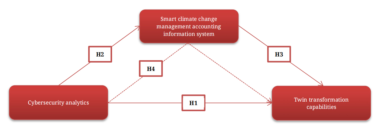 Twin transformation frequently entails the adoption of novel technologies and the implementation of creative procedures. With the support of artificial intelligence, the techniques of climate change management accounting prioritize the establishment of quantifiable objectives and the ongoing monitoring of operations. This is consistent with sustainability initiatives, which necessitate monitoring and reporting on environmental and social performance. Climate change management accounting is a developing field that improves openness and accountability in accounting and reporting procedures related to climate change. It delivers precise and dependable data by systematic measurement, analysis, and reporting of climate change and associated organizational expenses. The implementation of a SCCMAS enables organizations to effectively address the complexity associated with adopting new tools and methodologies. The effectiveness of SCCMAS guarantees that sustainable practices are not only temporary initiatives but are deeply ingrained in the fundamental principles and activities of the organization. This integration ultimately leads to the improvement and enhancement of TTC. Building upon the previously considered grounds, the hypothesis in this study is postulated as follows.