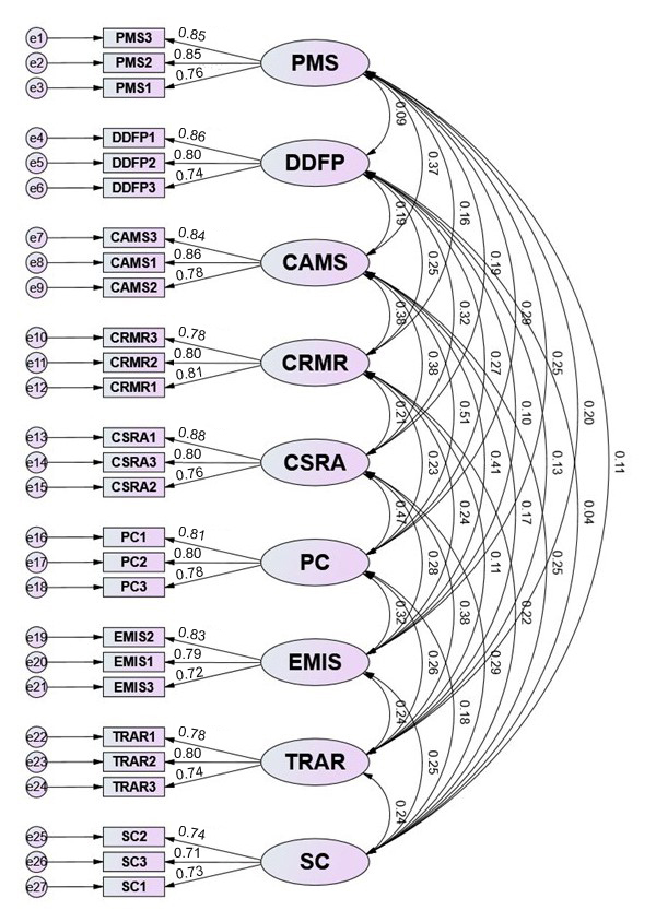 The structural model was employed to evaluate the hypothesized correlations in Figure 3.