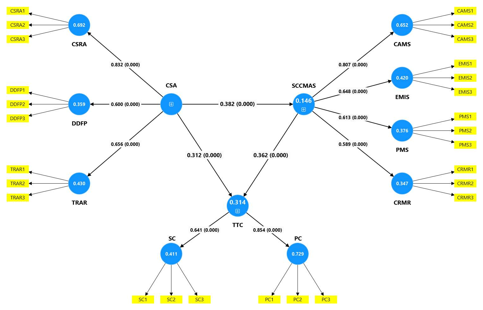 Full Structural Equation Modeling and Hypotheses Testing Direct effectBased on the bootstrapping outcomes (10,000 resamples) in Table 7, the statistical outcomes revealed that CSA induced a significant and positive impact on TTC (β = 0.312; t-value = 9.597; p-value = 0.000) and SCCMAS (β = 0.382; t-value = 11.904; p-value = 0.000). In the same vein, SCCMAS was found to induce a significant and positive impact on TTC (β = 0.362; t-value = 12.296; p-value = 0.000). Therefore, H1-H3 were supported.