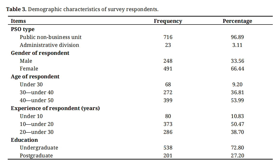 Prior to distributing the surveys to respondents in person, the researchers secured their informed consent. This would diminish the probability of participants providing erroneous responses to surveys, and allow researchers to guarantee the confidentiality and anonymity of the study’s conclusions. Participation in the study was voluntary, and individuals were guaranteed confidentiality and anonymity. They may withdraw at any moment and for any rationale. The study primarily focused on the accounting personnel of PSOs in Vietnam. To determine eligibility, the following criteria were established: (i) Participants must be presently employed in PSOs; (ii) They must possess a minimum of six years of professional experience; (iii) They must have knowledge of climate change; (iv) They must have knowledge of cybersecurity; (v) They must have knowledge of twin transformation; (vi) They must be willing to engage in the research. Participants recruited for the study who failed to meet the qualifying requirements were excluded. This sample size also satisfied the “10 times rule” approach, which was a commonly used method for estimating the minimum sample size in PLS-SEM. This method was based on the assumption that the sample size should be at least 10 times larger than the maximum number of connections between latent variables in the inner or outer model [103].