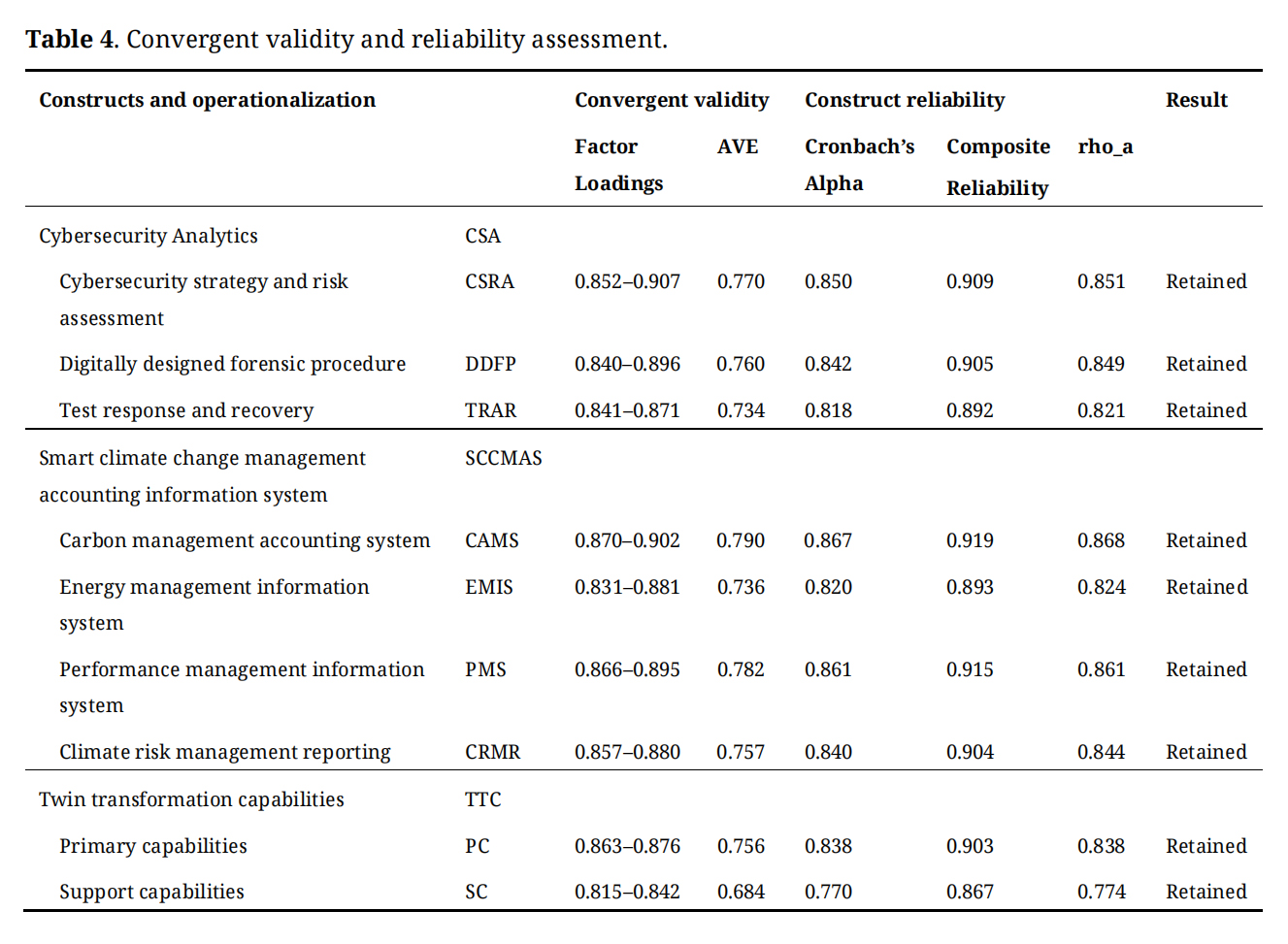 Furthermore, the results may motivate researchers to conceive novel concepts that address the increasing need for TTC. Utilizing the insights derived from this study, they can develop sustainable and socially responsible solutions to meet this urgent demand. The findings of this study also extend the existing body of knowledge on twin transformation by showcasing the capacity of CSA to augment the process of twin transformation. Given that conventional defense mechanisms are increasingly insufficient for tackling the complex risks that organizations encounter today [25], this study offers a comprehensive approach to cybersecurity that empowers organizations to prevent and respond to cyber threats as cybercriminal strategies evolve with technological progress. This study clearly delineates essential components of CSA that function as core parts, bolstering and supporting cybersecurity. Consequently, the findings of this study enhance the current body of literature about cybersecurity in the setting of PSOs in developing nations. Moreover, the main originality and significance arises from offering a thorough viewpoint on the mediating function of a SCCMAS in the correlation between CSA and TTC. More importantly, our findings indicate that CSA alone do not substantially improve TTC; however, its combination with SCCMAS does. The mediating effect of SCCMAS highlights its crucial significance in utilizing the integration of digital technology into climate change management accounting information system to enhance TTC.