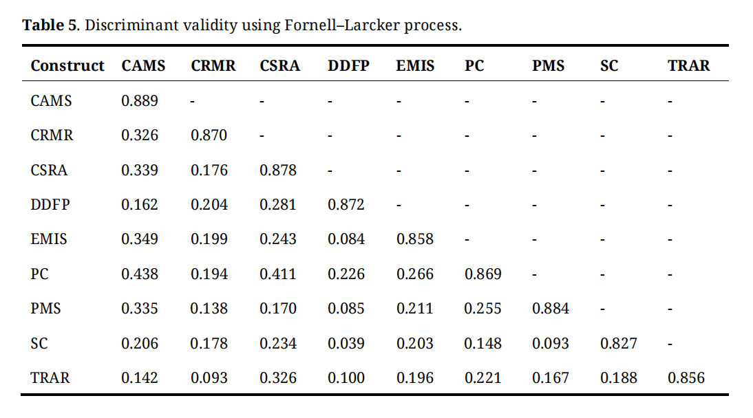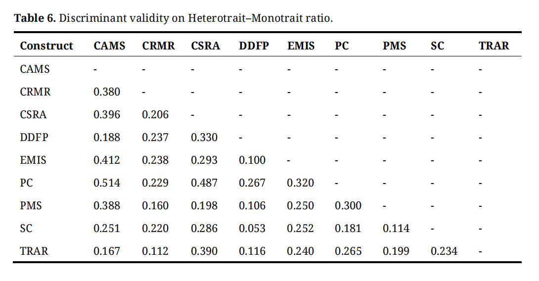 Correlations and discriminant validityTo assess the discriminant validity, the Fornell Larcker criteria [114] and the heterotrait-monotrait ratio (HTMT) [115] were employed. The Fornell Larcker criterion yielded results that satisfied the threshold value for all constructs. Table 5 indicated that AVE square root of each latent variable exceeded the highest coefficients of any other variables.
