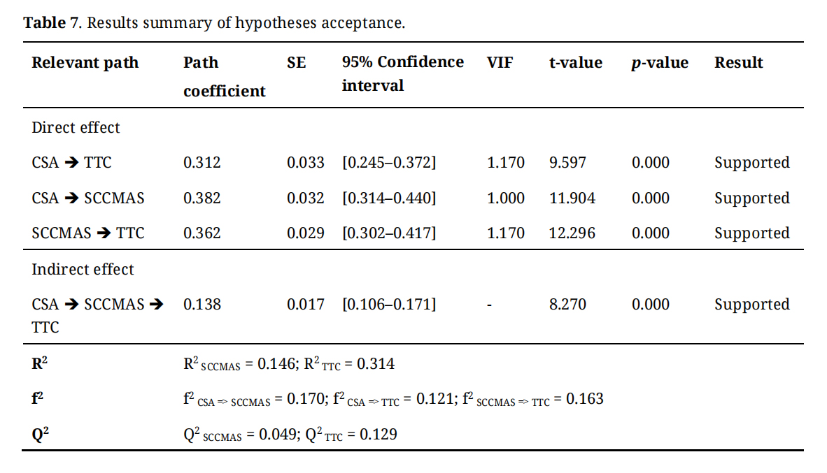Indirect effectThe significance of CSA’s indirect effect on TTC through SCCMAS was gauged. Given that the direct effect of CSA on TTC was also supported and that the indirect effect was notable (β = 0.138; t-value = 8.270; p-value = 0.000), it disclosed that SCCMAS partially mediated the relationship between CSA and TTC [110]. To that end, these obtained outcomes confirmed partial mediation.
