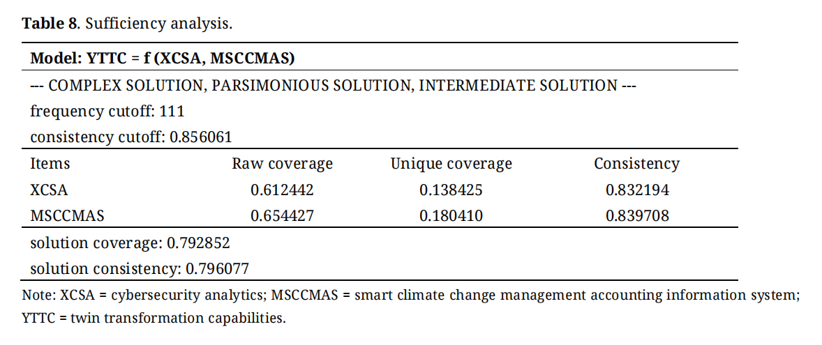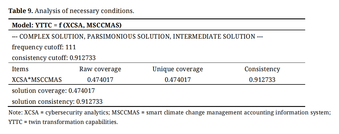 Necessary condition analysisIn the subsequent phase, a necessary condition analysis was conducted. This constitutes an INUS condition (insufficient but required component of a condition) that was unneeded yet sufficient for the outcome; [121]. The necessary condition evaluated if a configuration or an individual antecedent condition was essential for achieving the desired results [122], indicating the need to assess whether the distinct impact of each antecedent condition was requisite for the conclusion. A system consistency exceeding 0.9 often indicated that the antecedent conditions were requisite for the outcome [123]. The fsQCA findings were presented in Table 9. An in-depth analysis of the configurations indicated that the combination between cybersecurity analytics and smart climate change management accounting information system existed. This suggested that organizational managers will not succeed in obtaining twin transformation capabilities without accounting for both cybersecurity analytics and smart climate change management accounting information system.