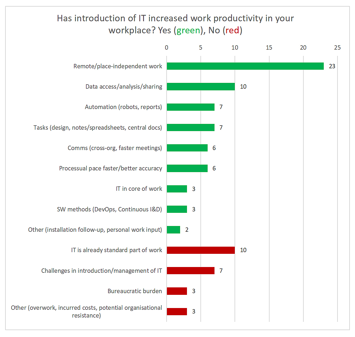 Impacts of IT in Finnish Workplaces According to Knowledge Work ProfessionalsRegarding the first research question of “What impacts in the use of IT in Finnish workplace organizations have taken place or been identified according to knowledge of work professionals?”, there found several findings. Based on experiences by the respondents on tangible work task level, certain answers indicated that it propagates transformational effects and trade-offs, which depending on implementation in workplace may improve some forms or foundational preconditions of work productivity, while also potentially inhibiting materialization of others for the improvement. The quantitative results indicated that in most workplaces Its are perceived as impactful in facilitating standardized work processes such as communications, development of core products, services, and processes, and financial management in particular, and the respondents with insights on the aims of digitalization as part of organizational strategy acknowledged the importance in improving productivity, reaching out new markets and/or customer segments, and staying in competition in particular.