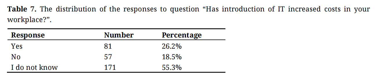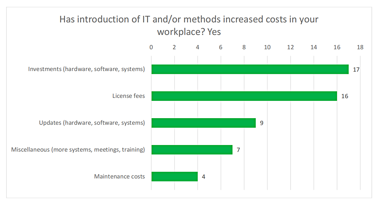 The “Yes” and “No” answers (see Figure 10) provided following major themes of open-ended responses: In case of “Yes”, 23 respondents outlined remote or place-independent work due to less time spent on travelling and more work done at home during the time and reduced personnel costs. Data and information activities were defined including easier, faster and real-time data search and access, electronic data forms and more data-based analyses, as well as information sharing via cloud services. The respondents also commented that “IT is part of our industry and without it there is no productivity” and “IT has been used for over 30 years, which has certainly made working more efficient compared to doing everything using pen and paper”. For the “No” answers, 10 respondents defined the standard nature of IT with comments like “IT has not been introduced, it has been always in use” and “it has been part of business since founding”. 7 answers reflected IT-related challenges such as “slows down work”, “increasing number of systems is causing confusion”, and “feasibility of new technologies is not evaluated beforehand”. The question on “Has introduction of IT and/or methods increased costs in your workplace?” produced 309 responses which shares are shown on Table 7.