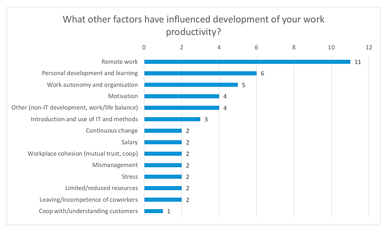 The final open-ended question of “What other factors have influenced development of your work productivity?” produced 48 answers which categorized themes are shown on Figure 12.