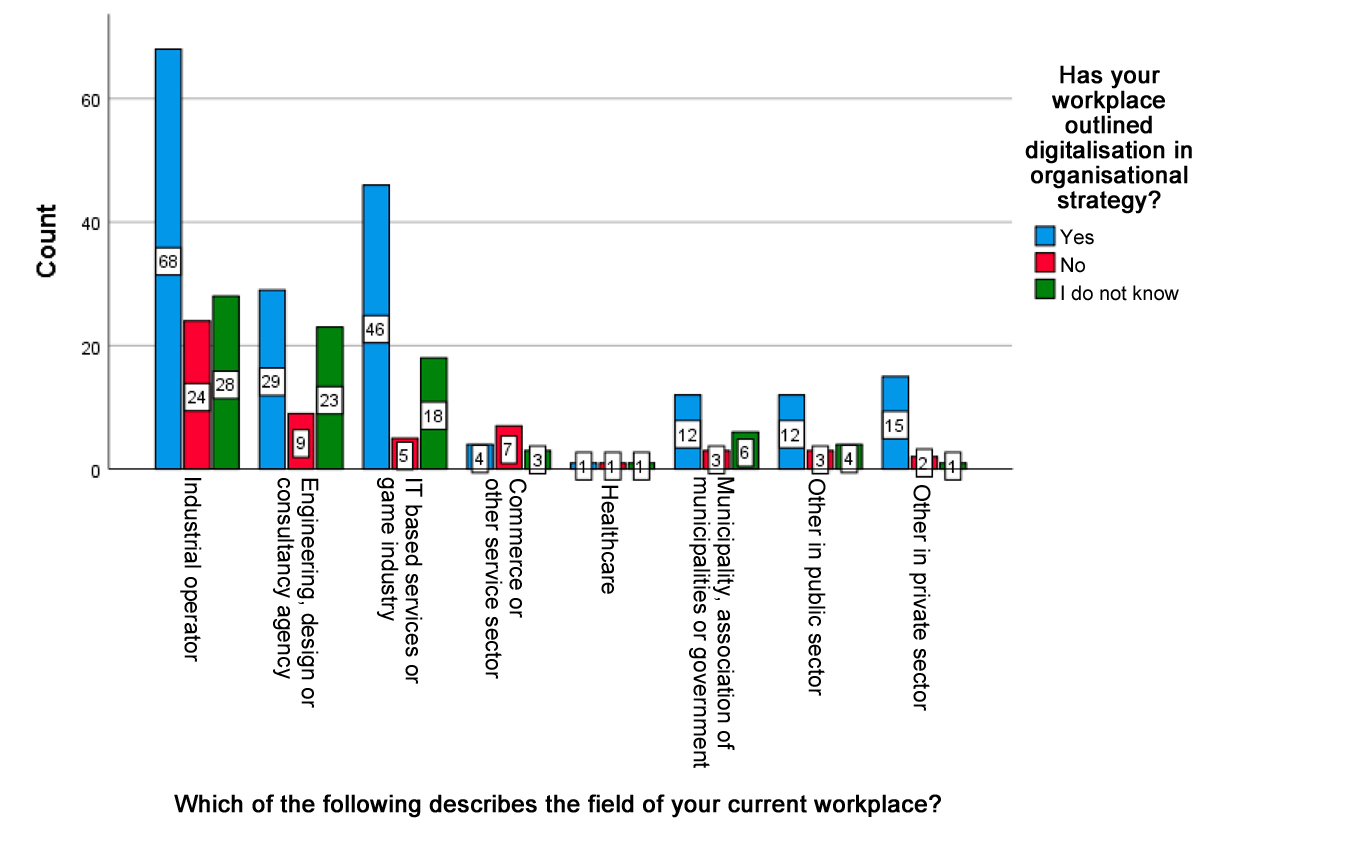 Furthermore, Figure 2 shows the current workplace responses (total of 325), which indicate that the fields where the “I do not know” answers amounted 25% or more were engineering/design/consultancy, healthcare, municipality/association of municipalities/government, and IT based services and game industry. The fields where “No” answers amounted 20% or more included commerce/other services, healthcare, and industrial operator. The “Yes” answers with rate of 57% or more included other in private and public sector, and IT based services and game industry. The high amount of the “I do not know” answers in respect to “Yes” and “No” answers in certain workplaces suggests that awareness about digitalization in the strategy may not exist widely among knowledge workers. Also, the “No” answers in particular indicate that digitalization may not be relevant in the fields which have not been traditionally IT-driven but more dependent on other inputs of production.