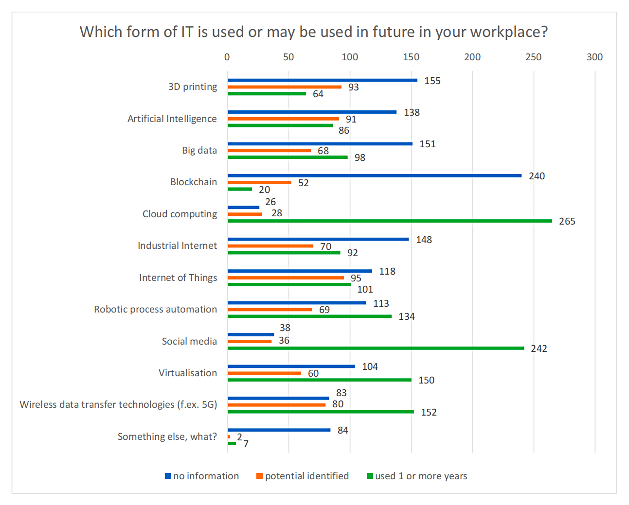 Figure 3 highlights the distribution of the responses to question “Which form of IT is used or may be used in future in your workplace?”. From Figure 3 it is indicated that certain ITs were widely acknowledged across workplaces as used for 1 or more years. In case of social media, further crosstabulation with the fields of workplace demonstrated over 50% rate involving other in private sector (88.9%), industrial operator (78.6%), engineering (70.2%), commerce/other services (78.6%), IT based services or game industry (68.7%), municipality/association of municipalities/ government (95.0%) and other in public sector (89.5%), while healthcare totaled only 33.3%. These rates may be because social media can be adopted relatively easily and its wide adoption by people inside and outside of the organizations. In case of healthcare, use of online social media may be less relevant part of the work than being physically present on-site (an area which should be researched further due to the small absolute number of answers in this study). Similar adoption rates resulted in cloud computing, where most fields stood out between 78% and 95% of adoption for one or more years, with exception of healthcare (66%).