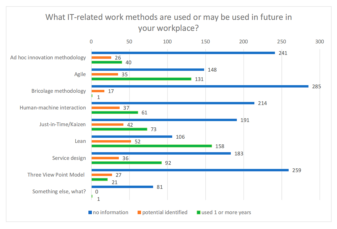 Figure 4 covers the results of the questions ‘What IT-related work methods are used or may be used in future in your workplace?” From Figure 4 it is noticed that lean, agile, human-machine interaction identifies more potential use of IT-related work methods which are used 1 or more years.