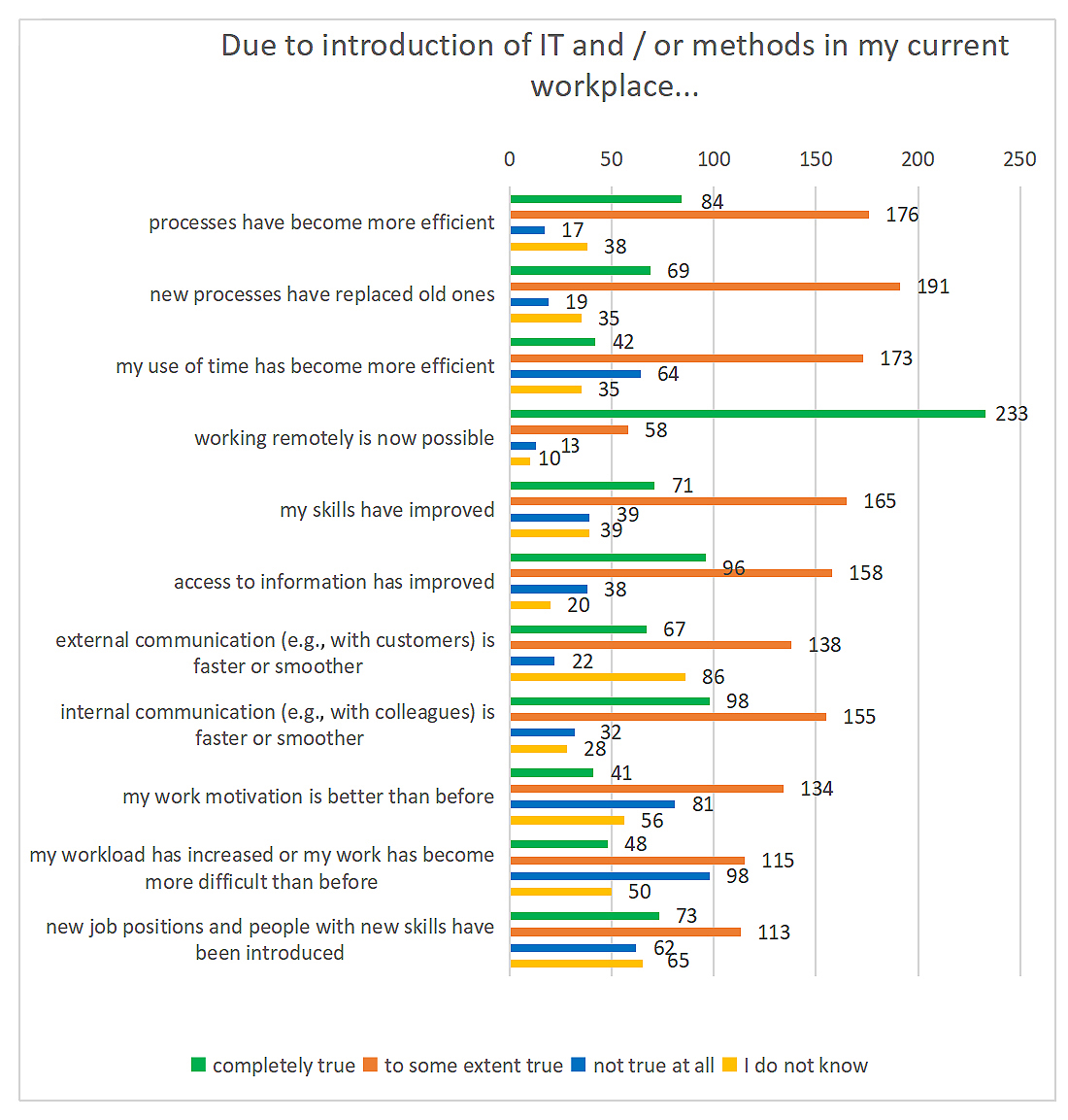 Figure 5 highlights the outcomes from the question ‘Due to introduction of IT and/or methods in my current workplace...’. From Figure 5 it shows that remote working is universally acknowledged as “completely true”. Using crosstabulation, over 65% answer rate was reported in most workplace fields except for the commerce/service sector (42.9%). This may relate to physical presence required in the workplace field, which cannot be substituted with online presence. On other options, the high number of responses on “to some extent true” reflect that the pros and cons have been recognized as impactful on personal work involving skill improvement, access to information, communication, and processual development, while also increasing workload or difficulties in work.