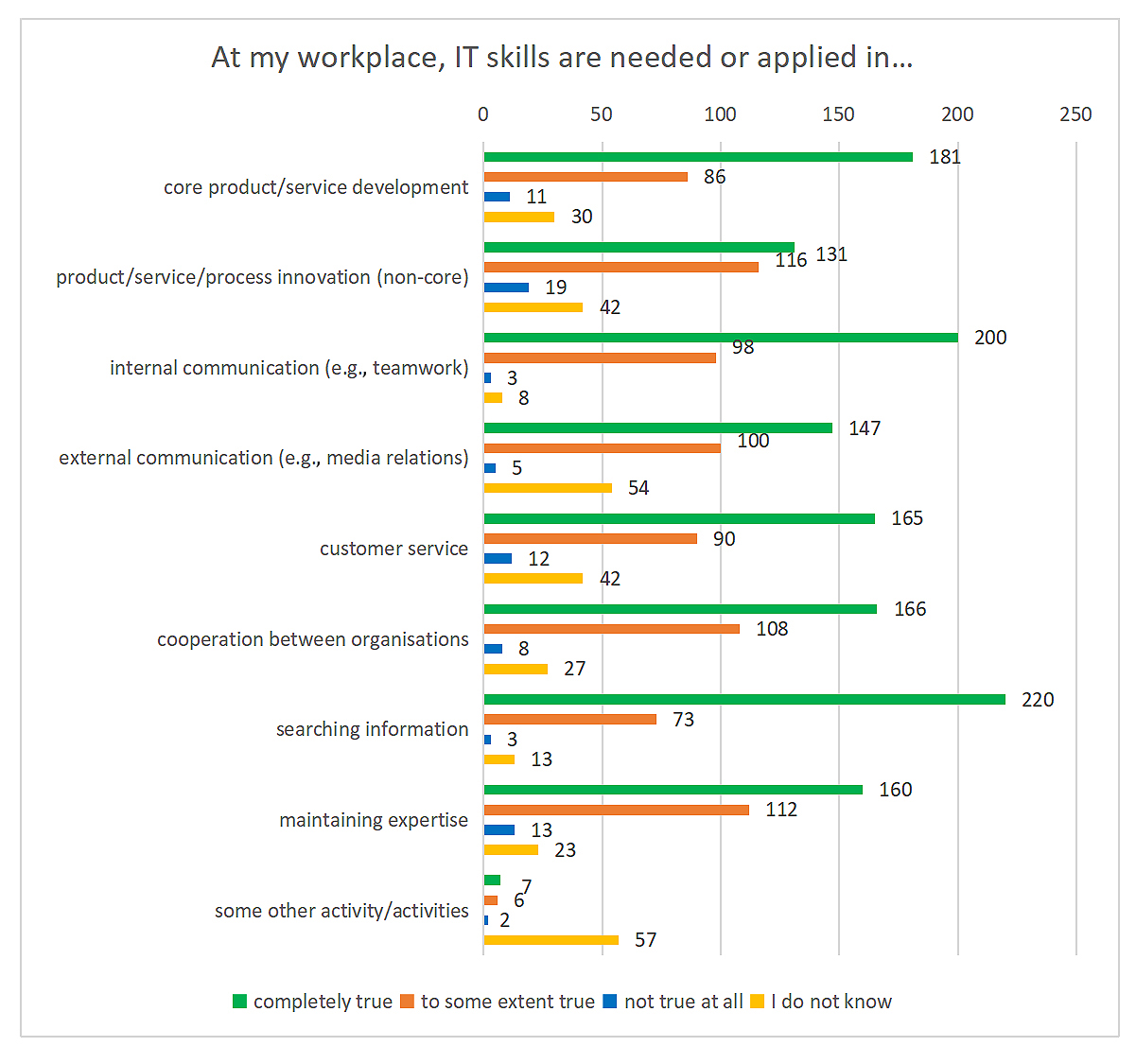 The matter about areas where IT skills are needed or applied was asked on a proposition basis as shown in Figure 6 with the responses. In overall, a high degree of use of IT skills in workplaces can be seen with combined “completely true” and “to some extent true” answers, which suggests that IT skills are relevant in workplaces to carry out work tasks which can be determined as involving knowledge work (for instance, in searching information or communications). Also, similar response tendency can be seen on Figure 6 on core product/service development, innovation, and internal and external communications, with innovation option scoring the lowest for “completely true” answer after the open-ended “some other activity/activities” option. Regarding the open-ended option on some other activity/activities, the produced answers included in all or almost all tasks, financial management, and data/information management handling and analysis.