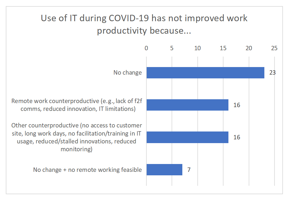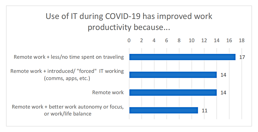 The impacts of COVID-19 in workplaces have varied across industries, with the major theme being the digitalization of work primarily to enable IT-based remote work. Accordingly, examining the matter was relevant to understand how the pandemic has shaped work according to the knowledge work professionals in Finnish workplaces. Figures 7 and 8 respectively displays the final part involving statement of “Use of IT during COVID-19 has and has not improved work productivity because...”, gained 125 open-ended input responses. Most of the answers (72) involved remote work in one form or another.