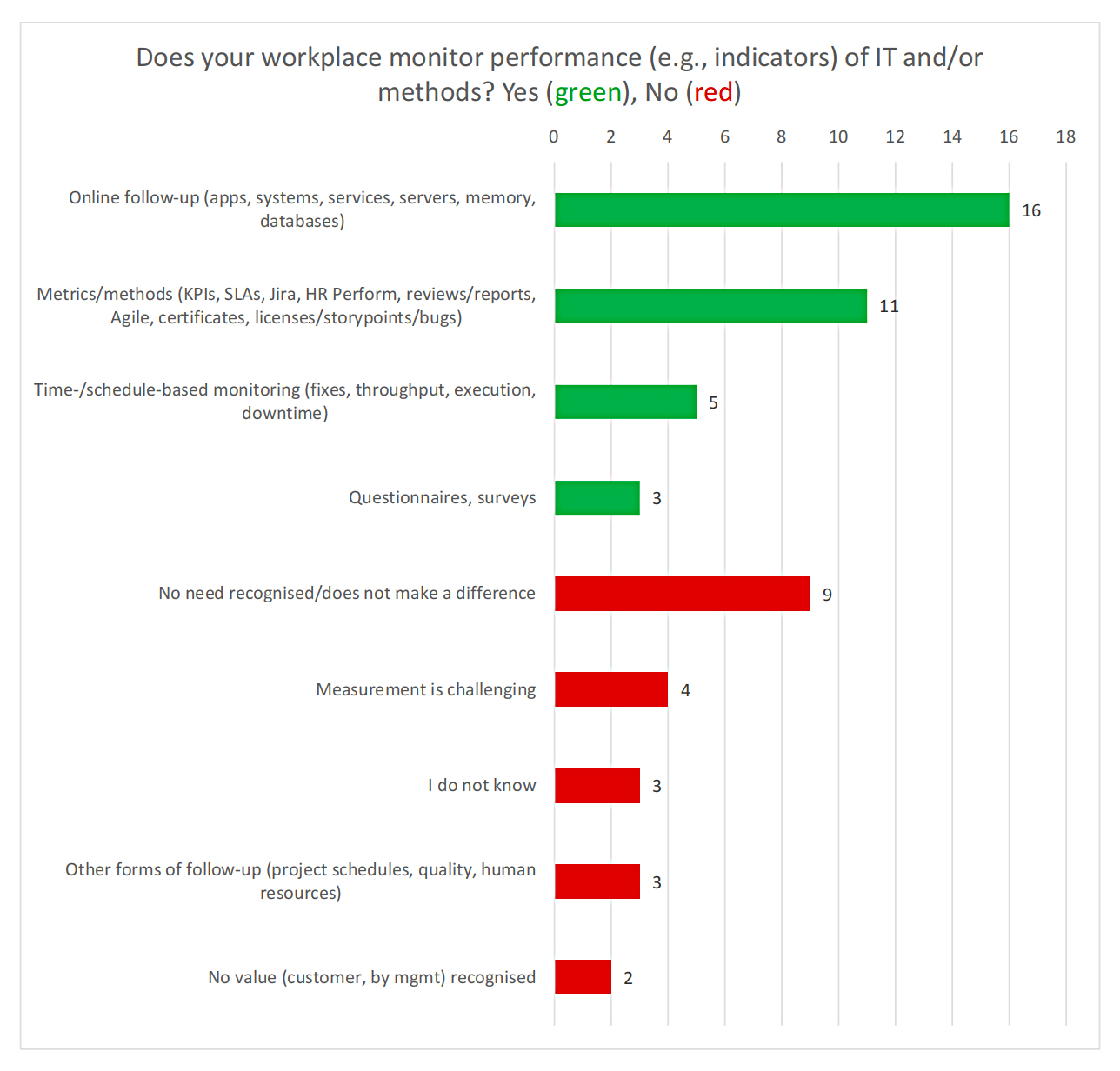 Based on Table 5, around 60% of the respondents do not know whether any performance monitoring of ITs and/or methods takes place in the workplaces. The “Yes” and “No” answers provided open-ended responses with major themes as follows as shown on Figure 9: 16 answers defined concrete areas such as process monitoring, application performance, standby rate, data correctness, servers, system functionality, and use of test automation in determining quality of continuous integration and solution delivery. Measures or methods used covered tools like Jira, human resource (HR) performances, quarterly reviews and yearly reports, key performance indicators (KPIs) and 24/7 dashboards. In case of “No” answers, most answers defined that need for the measurements has not been recognized, for instance, one respondent defined that “functions have been digitalized a long time ago, so self-evident use does not need to be measured”, and others defined that “monitoring has been jointly determined as useless” and “we do not measure anything anyway”.