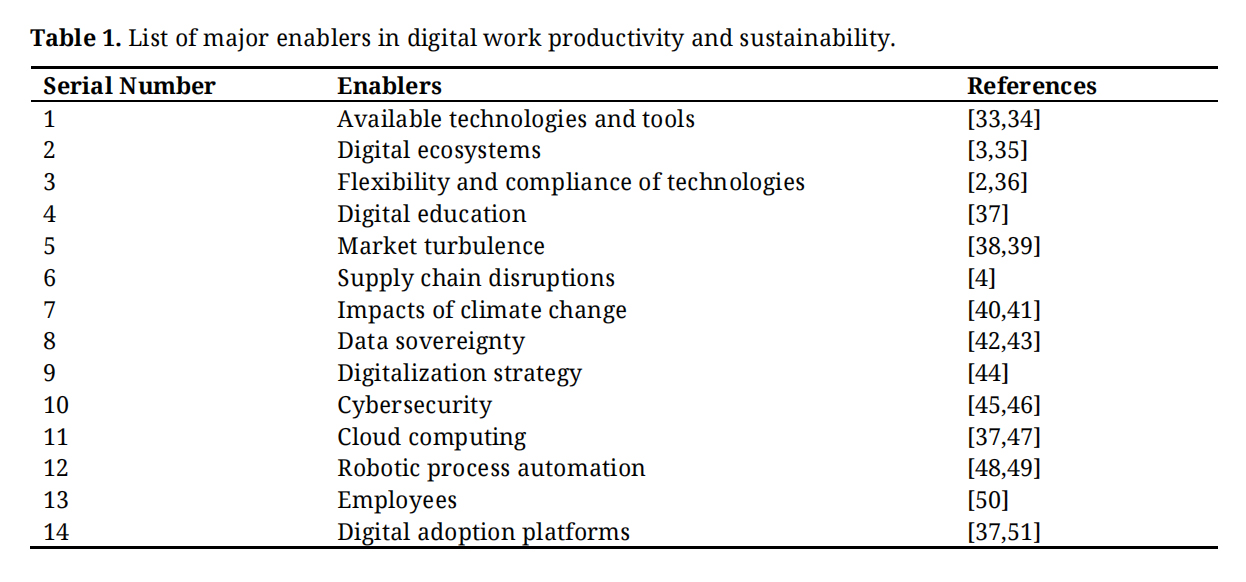 Enablers in Digital Work Productivity and SustainabilityCompanies all over the world have been working on digital transformation for several years, but considering the COVID-19 pandemic, some of that work must be focused on reconsidering the conventional office setup. During the epidemic, the experience of working remotely led many to oppose the prevalent paradigm that necessitates being physically present in an office full-time. Nowadays, a lot of workers choose arrangements that allow for a personalized, real-time, mobile-enabled, and collaborative digitally driven work experience and cover all the information, technologies, tools, and procedures utilized in a workplace [33]. To improve digital work productivity and sustainability, several enablers contribute which can be summarized in Table 1.