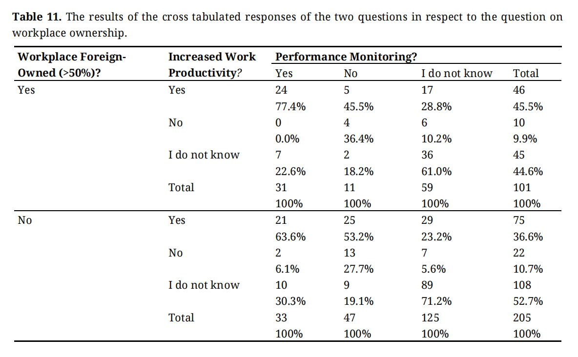 The contexts involving Finnish and foreign workplace organizations were reflected with the two questions to see whether the factors could introduce differences over the areas: (i) Is your workplace a foreign owned (over 50%) company? (ii) Has the introduction of IT increased work productivity in your workplace? (iii) Does your workplace monitor performance of IT and/or methods? Table 11 demonstrates following findings: first, foreign-owned companies which exercise performance monitoring (“Yes”) acknowledged also increased productivity (“Yes”) over the other responses (“No”, “I do not know”). The distinction between foreign-owned and non-foreign owned companies/organizations is interesting: first, the foreign-owned companies with the “Yes” answers on performance monitoring show up with zero “No” answers on increased productivity.