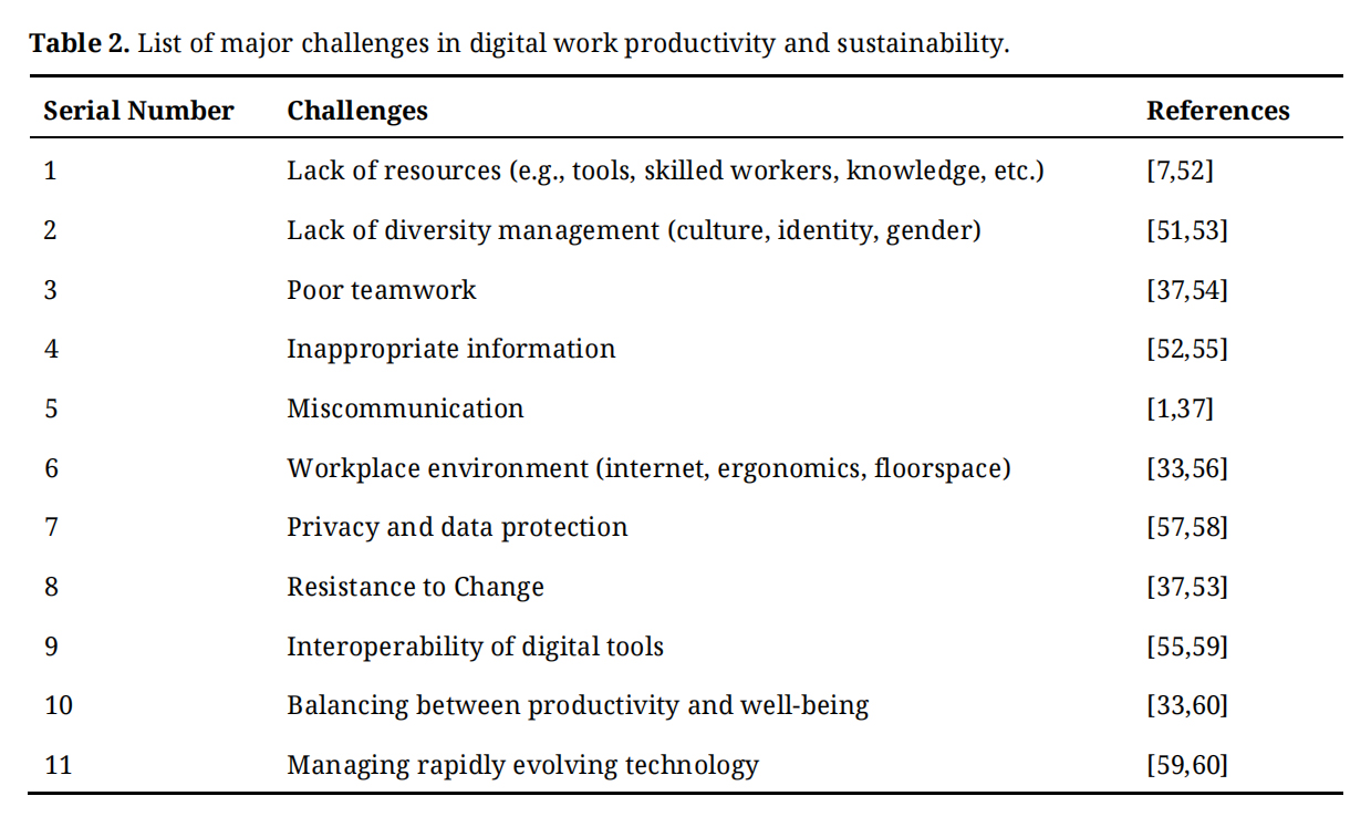 Challenges in Digital Work Productivity and SustainabilityWith the advent of digital transformation, organizations now have access to a vast amount of information at an unparalleled rate of changes. However, knowledge workers who must cope with rapidly unpredictable, complicated, and unclear situations today face several challenges. Workflow collaboration technologies are being used more and more in this situation to handle this new style of working and boost knowledge worker efficiency. The most common challenges in digital work productivity and sustainability are summarized in Table 2.