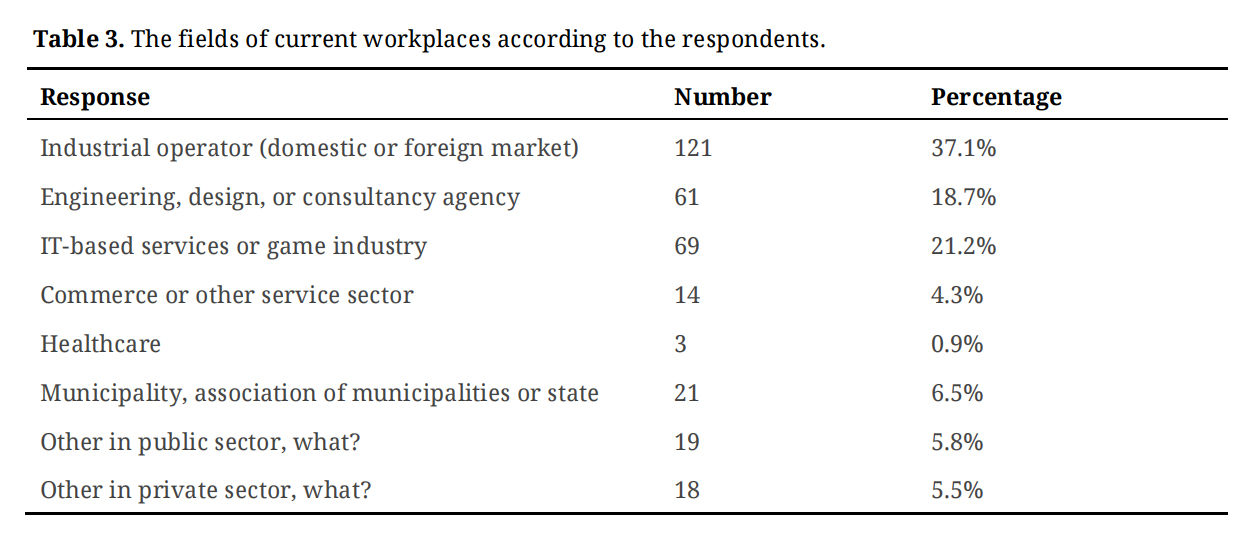 Workplace background informationBased on the respondents, the field of current workplaces are presented in Table 3. From Table 3, it is seen that the respondents working in industrial operator-based workplace organizations are the largest group, while IT-based services or game industry and engineering, design, or consultancy agency are the second and third largest.