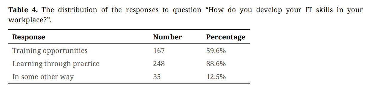 Regarding the question of “How do you develop your IT skills in your workplace?”, three answer options were inquired: training opportunities, learning through practice and/or in some other way. The total number of responses of 450 were distributed as shown in Table 4.