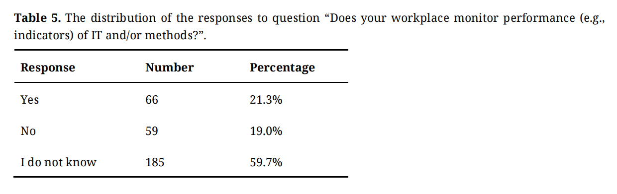 The final questions covered IT and work productivity in workplaces: performance-based monitoring of IT and methods, and the impact of IT and methods on work productivity and costs. The first question asked, “Does your workplace monitor performance (e.g., indicators) of IT and/or methods?”. Distribution of 310 responses is shown in Table 5. The question was to provide insights into how IT and methods are measured to ensure that their productivity (or lack of it), for instance, can be determined in a tangible manner.