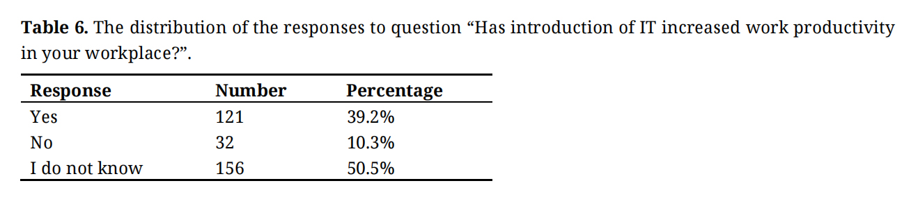 The next question “Has introduction of IT increased work productivity in your workplace?” produced 309 responses as distributed on Table 6.
