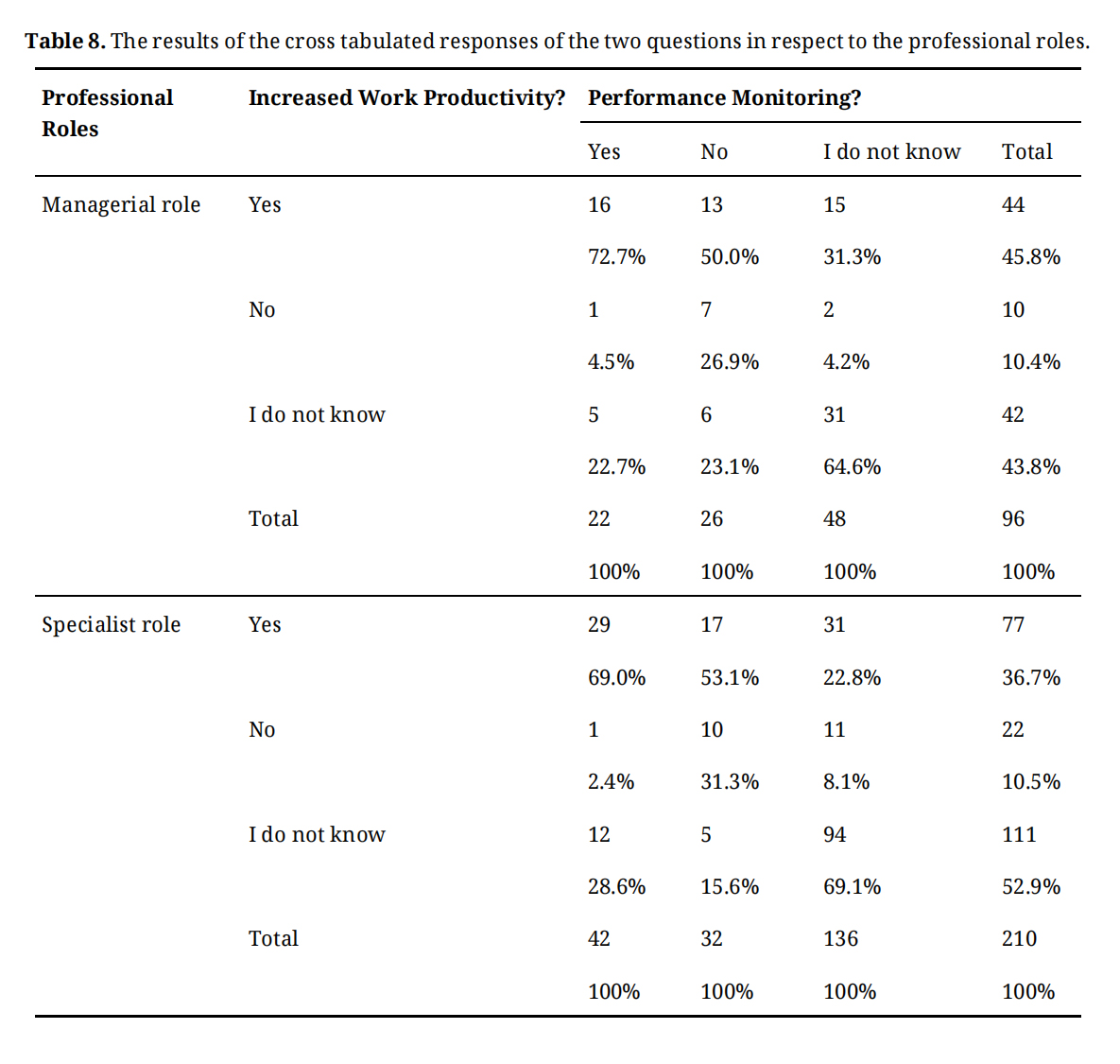The professional roles and workplace sectors were reflected in respect to the results of the two questions on increased productivity and performance monitoring of IT. As shown on Table 8, the managerial respondents recognized more often the impact of increased productivity (“Yes” answers under Total column) than the specialists who also reported over 50% of unawareness (“I do not know” answers under Total column), i.e., almost 10% more than the managers; also, the specialists reported the highest number of “I do not know” answers to the questions in relative and absolute numbers, underlining unawareness on the increased productivity and performance monitoring. Still, the rates of “Yes” answers to the two questions in both professional roles are relatively high in respect to the other answers options, which may suggest that awareness on the performance monitoring and increased productivity has a linkage, i.e., the follow-up of IT performance has been used in validating the increased productivity of IT.